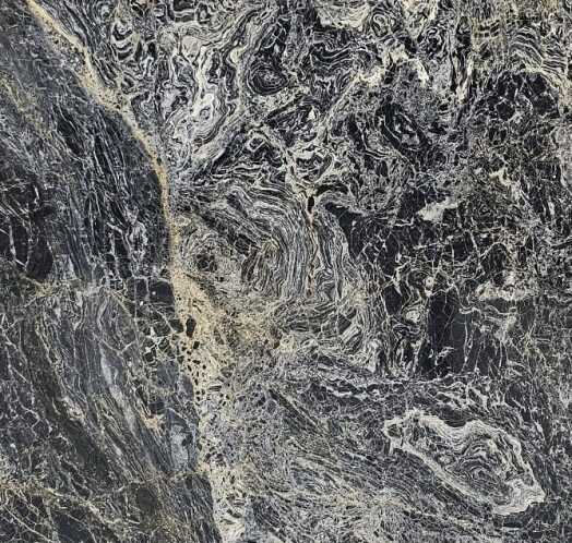 This incredible marble has a dark charcoal background with stunning white, cream and gold vein movements.